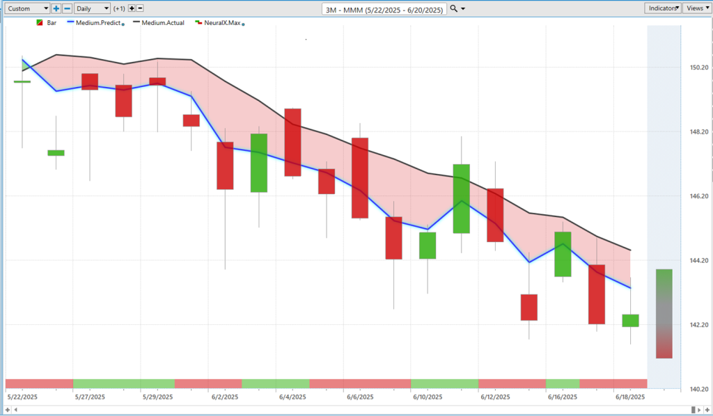 You see we have a very sort of jumpy market here in shares of 3M. The neural index, you see, going bullish here, back to bullish, back to bullish—but the overall trend here, very bearish. And when you have that really intraday tool of the predicted highs and lows, this is what makes traders aware of when to take profit, when that trend is shifted—maybe a really great time to get out of the market if you’re on the bullish side here.