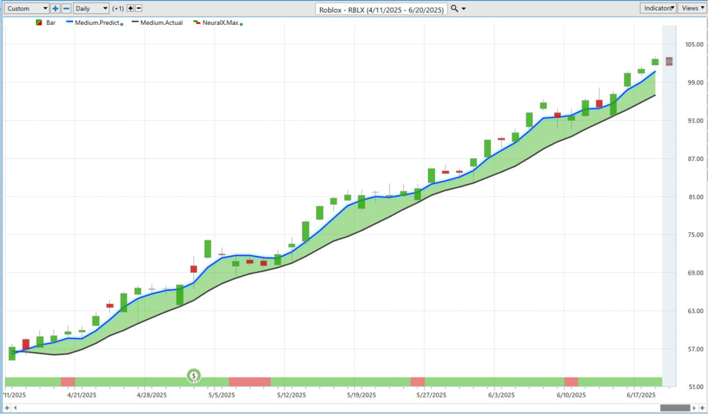 Next, we have Roblox, another market that’s been in a really strong uptrend. Again, we see this blue line crossing above the black line. You get a couple of periods where the neural index goes bearish, followed by some subsequent sort of sideways price action—but very clearly, the predicted moving average is saying this market is in an uptrend. You’d want to be buying, taking profits on those long positions.