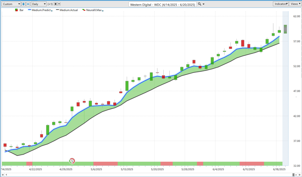 Lastly, we’ll end here on Western Digital. So in the storage and computing space here, in Western Digital, we see a very similar forecast. Blue line very clearly above the black line. Again, you’ll get these little blips where the neural index is bearish—but notice how we don’t even get close to that blue line crossing below the black line.