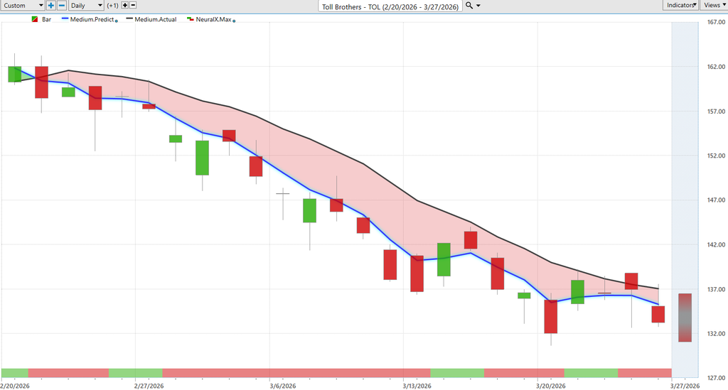 Market. Uh, here’s Toll Brothers, and this has just been an area where, again, you see a lot of weakness, uh, and things like LAR, Dr. Horton, a lot of the building material companies, uh, here in Toll Brothers as well. You see market moving into a downtrend. Again, the neural index very, very short term, right? So it’ll warn you of subsequent price strength just over the next 48 hours.