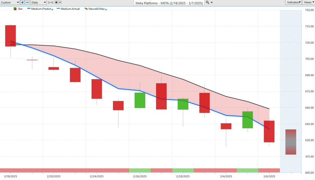 But in addition to those predictive indicators, Vantage Point’s also providing a predicted high and a predicted low, so when it comes down to intraday price or day trading, these are levels that are provided via also that predictive technology, but now again, tuned to solve an even shorter-term problem of intraday price action. So if we bring up all of those predictions against the actual market data, well, we can see what has been the forecast here for Meta. Well, clearly, we’re in a downtrend, and you’re getting these levels highlighted as really the extremes of intraday price, that if you want to take a short position, well, that’s where you’d want to look to. So you actually see this is actually Monday this week, this is Wednesday this week, and again, these markets moving down towards these predicted lows, uh, where traders can look to take profit or keep establishing or building a position here. So we see the trend still bearish, uh, overall Meta shares now down a little bit more here again, not as much as that, uh, uh, you know, 16% on the Russell here, um, but off about 10% here just in the past uh, 11 trading days here.