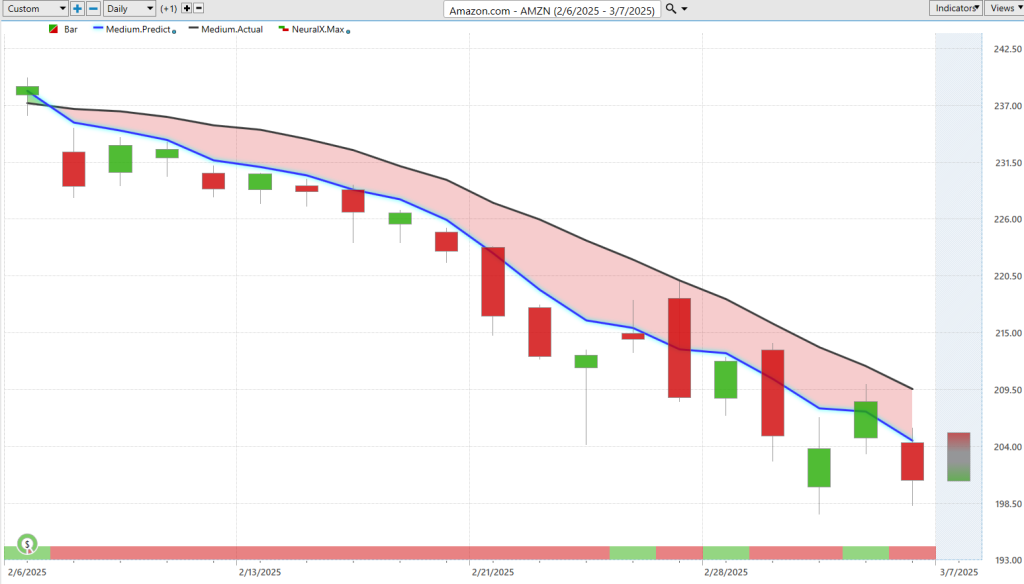 Uh, here are shares of Amazon ($AMZN), and we looked at this last week as well, so I wanted to just again highlight some of these shorter-term predictive indicators but again, highlighting that broadly there’s market weakness, right? We’re looking at Meta, Amazon here, the major indic, and recognizing that there’s broad-based weakness across the market going into the market this week. Well, we can look towards those short-term predictive indicators, and again we have these predicted highs standing out as, okay well if you’re doing any trading, clearly in Amazon it’s saying the trend is lower, uh we may get some choppiness with that neural index going bullish, but you actually see what’s interesting about this is if you have a limit order waiting on a trading day like this, you’ll just get filled at the open as the market gaps up and immediately that weakness plays out and the market starts trading lower. Uh, so again, the next day, pretty much filled at the high at the high here, uh, and and benefiting as we see this weakness again across prices generally.