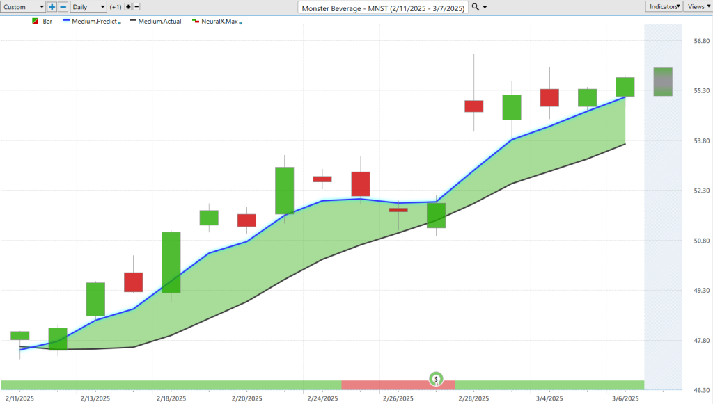 Now I wanted to flip things around here just to highlight that the Vantage Point indicators work regardless of the broader market condition, so certain individual stocks, well, are currently in an uptrend, and so if you’re trading, uh Monster Beverage ($MNST), or potentially looking for bullish opportunities, well, here we see Monster Beverage, one of the fewer areas in the market where that blue line is solidly above the black line, neural index bullish. Now we have earnings right here in the middle of the chart, but notice how even despite earnings, how accurate all of these forecasts are. The overall trend is up; certainly, there