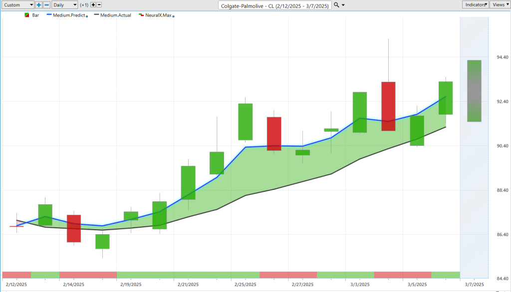 Additionally, here Colgate-Palmolive ($CL) has been another one of these rare instances where a lot of strength from our blue line above the black line. Again, you’ll get these periods where you see early on, the neural index gets bearish, and you get a little bit of a gap down the next trading day, but the Blue Line every single day remains above the black line, and so overall, the trend is bullish here. Again, we see these little gap down, uh, days coming after that neural index gets bearish, and again, we can look towards the Vantage Point predicted highs and lows, and you see how this works here is even early on, where you get that snap lower, what’s happening is you’re just moving down to that previous predicted low level. And within that, you know, 24-48 hour window, you’ve got excellent levels and guidance here, uh, to be a buyer in the market and know what levels are appropriate here. So again, you see about four or five entries, uh, on the way up, but again, noticing that broadly here, the overall trends are bearish, right? So, you know, bringing this through just to sort of add some context of, you know, even in a bearish market, well, where there’s strength, these indicators will skew in this case to the bullish side, uh, and you see actually a lot of separation there, right? So, going into a week like this, where we’ve just gotten more weakness from the broader market indices, very clearly here, Colgate, and Monster, uh, in a pretty strong uptrend.