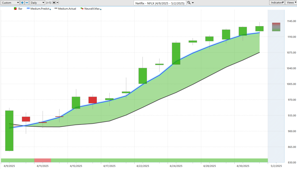 But once you get that noise of earnings, the software is doing its job every single day — producing these predicted highs and lows, updating the neural index for the trader.