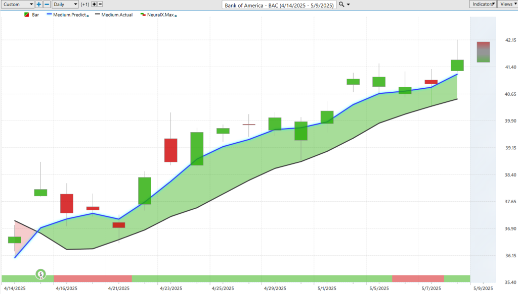 More traditionally here, here’s Bank of America. It’s a very popular stock. Very clearly here, back in the middle of April, crossover to the upside after earnings. You see that the neural index gets bearish here, and you get weakness for the next 48 hours. But look at that separation between the predicted moving average and the actual moving average. It’s a very strong market. We get a little bit of a blip here in the middle of this week, but very clearly an area where you want to be a buyer. Also sends you some valuable information about, “Hey, what’s going on with financial stocks?”