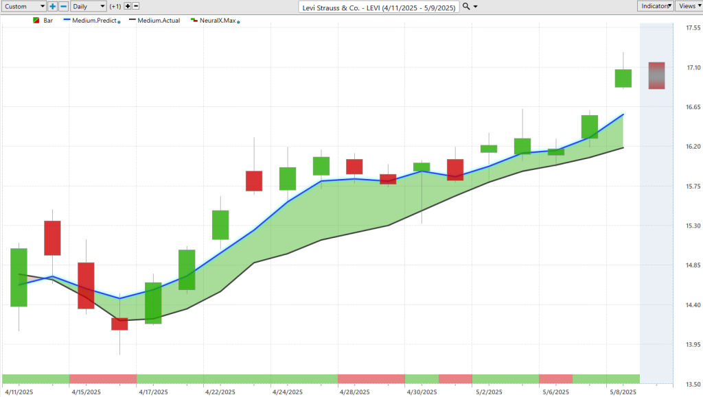 You see about five entries just in the past couple of weeks here as shares of this market advance. So, really exciting opportunity here in Levi, and it gives you a little information—again, just like financials—about the space: that there is some bullishness here. We are seeing bullish forecasts—about a 16% rally in 18 trading days on shares of Levi Strauss.