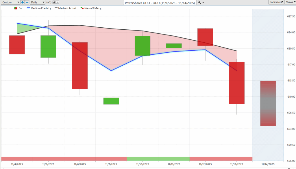 And so here we see the Q’s very clearly. This forecast going back really to last Wednesday with that blue line moving below the black line. Uh, we got a lot of volatility around the futures market overnight and a big gap up. And so I see that neural index goes bullish — you get a couple days of strength — but this is actually Wednesday. The neural index goes bearish. You see that blue line below the black line, signaling we’re still in a downtrend.