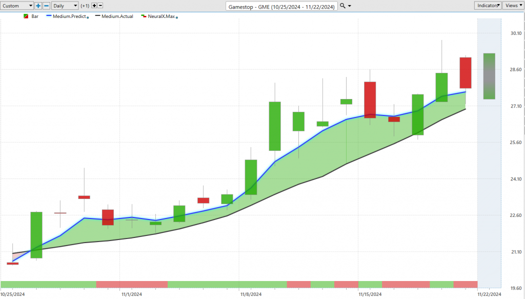 And so whenever we see that blue line cross above the black line, what’s suggesting is, look, average prices are expected to start going higher, and as long as that blue line remains above the black line, you’d expect the overall trend to resume higher. So you see here about a 26% rally in just 19 trading days in shares of GameStop but more importantly, we can take a close look at these other indicators. If you look at the bottom of the chart, this is our VantagePoint neural index, and it’s solving a different problem for traders.