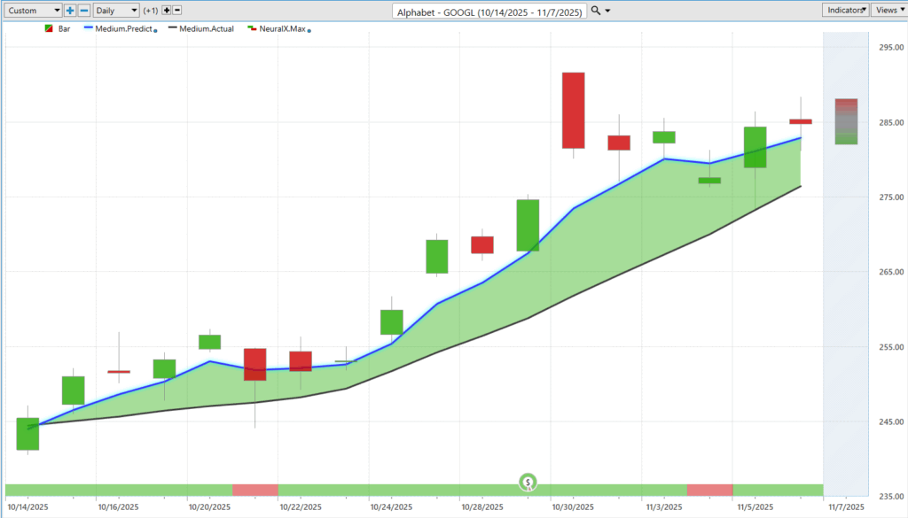 Now, much more popular Alphabet (GOOGL) stock here, shares of Google. And so once you understand one forecast, it really works exactly the same way regardless of the markets that you’re trading. Uh, and here we see with Google (GOOGL) that blue line getting freshly above the black line, neural index bullish.