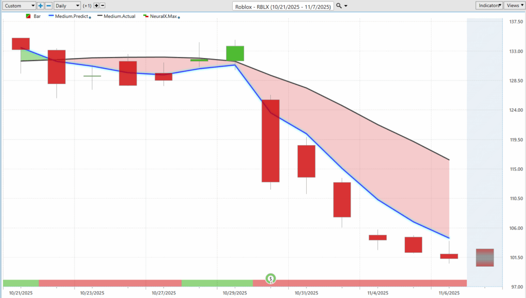 Here’s Roblox (RBLX), and I brought this through last week. A nice opportunity to update the forecast. Now, uh, you always want to be careful around these earnings reports, right? So this is a big earnings report day. Uh, obviously, the market was in a downtrend going into that.