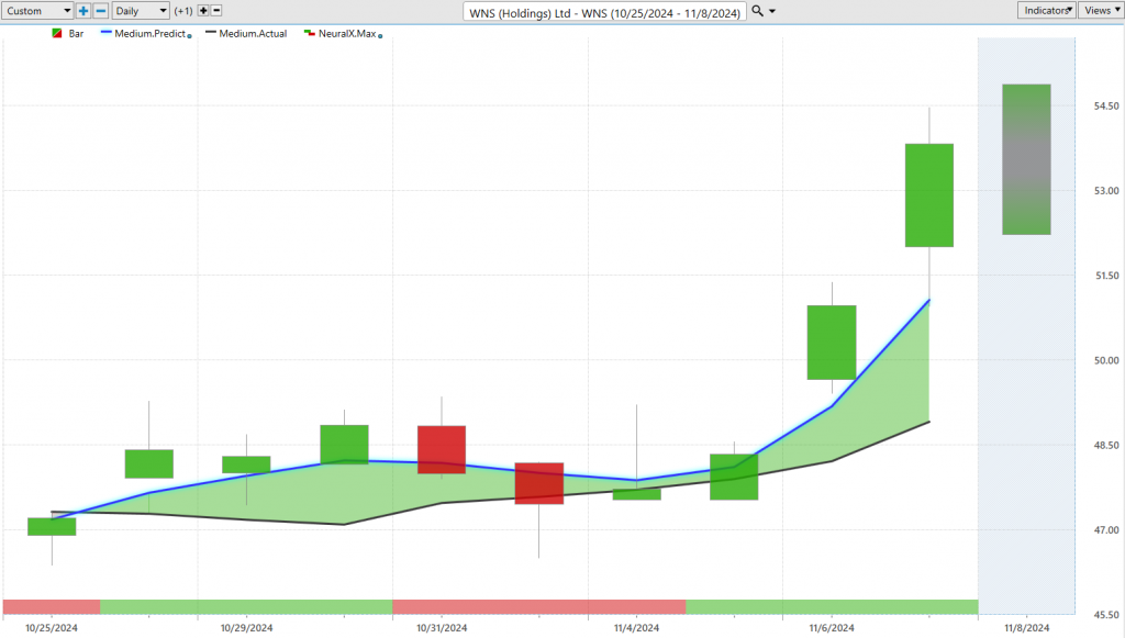 So, we have a good example of how all this works in shares of WNS Holdings, and so, what you’re seeing here is daily price action, right? So every single trading day, you’re going to get a new candle presented on the chart, and it’s right up against that price data that the first thing that we need to understand is that there is a black line and also a blue line value. So the black line that you’re seeing there, well, that’s actually a simple moving average, so a very common technical analysis tool, and in this case, it’s a 10 period, so to look at the previous 10 close prices, add those all together, and then divide by that number, and so that acts as a baseline for Vantage Point traders to really know where market prices have been. But often, tools like that, one of their weaknesses is that all of that data just really summarizes the past, right? Those previous 10 candles and also, it’s only looking at one market in isolation. So in this case, WNS Holdings, this being a staffing firm and a consulting firm, and so what Vantage points able to do is compare that black, or what we might call a lagging or actual moving average, to this proprietary predicted moving average, and for this calculation essentially of future prices to get calculated and plotted on the chart every evening. Well, this is where the technology of artificial neural networks comes into play and are performing what we would call intermarket analysis, and so what that means is that to help predict the future price of where this asset is heading, Vantage Point is looking at really dozens of other markets that are known to drive and influence those future prices. So that can be very obvious things like the S&P or the NASDAQ, the larger indices, but it’s able to understand subtle market relationships and really extract some price clues that are valuable to Vantage Point traders, and so those can be from ETF groups also individual stocks as well as global currencies or interest rates and even global commodities like corn or wheat or gold or silver, and so it’s able to take this global approach and with a very high level of accuracy predict where prices are headed next through these predictive indicators. So whenever we see that blue line cross above the black line, what suggesting average prices are going to start going higher, it’s those intermarket relationships that are really skewing the forecast to be more bullish, and so we can actually enter a lot of these search criteria into the Vantage Point Intelscan. So if we’re looking for new opportunities, we can actually say, okay, well where is this predicted moving average having a fresh crossover of the actual moving average and really make sure we identify a lot of these opportunities very early. So we see in this case since that blue line crossed above the black line, we have a 12, 1 12% rally here, even just 100 shares on a pretty cheap stock has you up about $600, but that’s not the entirety of how all of this works, is if you look at the very bottom of the chart here, you’ll also see this bar that goes from green to red and back to green, and this is another indicator utilizing those artificial neural networks, but they’re tuned to solve a different problem for the trader, and that is short-term strength over the next 48 hours. So you can really think of that as just a couple of trading candles at a time. So you’ll notice that when we get that blue line crossing above the black line, we do get this period where that neural index goes to that bearish configuration, and you’ll notice that you get subsequent price weakness over the next couple of days, but as that neural index goes back to bullish, that’s where we see all that momentum come back into the marketplace, and so that’s very helpful for shorter-term traders and also traders trying to identify that momentum within the trend. But to really round this out where really gets exciting is you’re also provided a predicted high and low, so these levels are provided every single trading day before the market opens and lets you know that okay, well when we got this cross over to the bullish side, where do you want to be looking to accumulate a position, and you see that early on in this move, we get about four entries, the predicted highs and lows slide down letting you know expect a little bit of market weakness, expect prices to potentially trade down at these levels, but the overall trend is very bullish, and we see this market doing very well through the election cycle as a lot of liquidity returns to the marketplace. So really nice move there in WNS, and a really good example again of how all of these predictive indicators work together. If you’re a trend trader, you can recognize those shifts, understand when there’s short-term strength or weakness in the market, and then of course, use those predicted highs and lows to really fine-tune again whatever that strategy is and what time frames you’re working in.