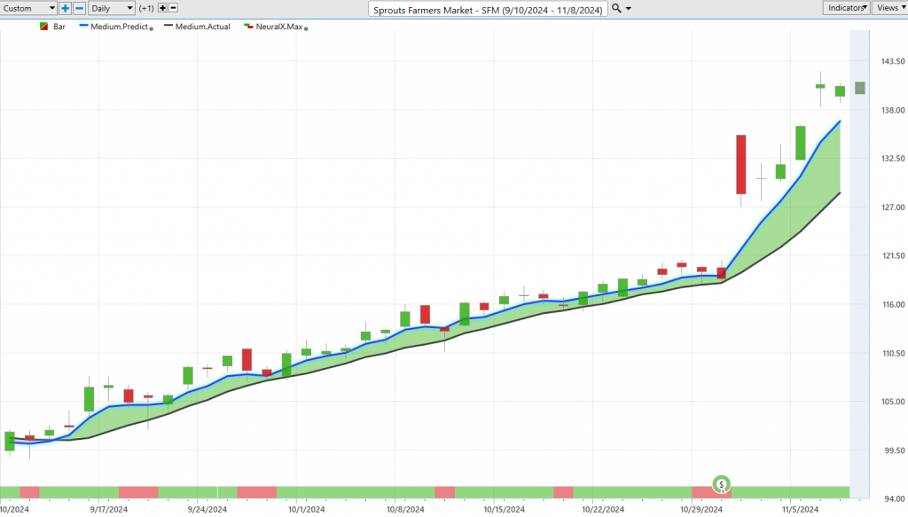 Sprouts Farmers Market here’s Sprouts Farmers Market again another example, I think we looked at this a few weeks ago but a very strong bullish trend here, and what I really want to highlight here is those predicted highs and lows, so you can see we’re going back all the way now two months of data and when we look at those predicted highs and lows against the actual market data well we can see that look the overall trend’s up so how do we want to be looking at these predicted lows well they would stand out as good buy points, and you’ll notice that pretty much within a couple of trading days from those predicted lows being hit you see the market going high, and that trend resuming, getting a lot of that volatility around earnings and then election and really everything working out well here for Sprouts Farmers Market in a very solid uptrend. So again, we can take a look at the overall move here a 37% rally in just the past 40 trading days, there’s a lot of markets that are doing extremely well, but of course where we see that predicted moving average below the actual moving average those markets and downtrends you can really just ignore them and really focus on where that strength in the market is about a 37% rally there.