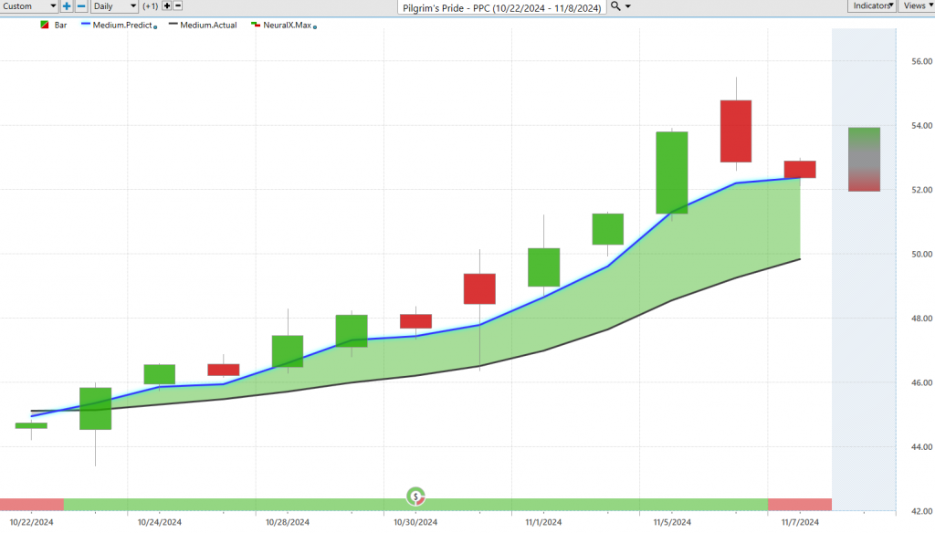Here’s shares of Pilgrims Pride, very similar example here, and I want to highlight here the neural index because this indicator has an accuracy of upwards of 80 plus% on really a wide number of markets, and that’s really incorporating things like earnings reports and elections and all these sort of you know event risks that enter into the market, we still have upwards of 86, 87% accuracy on a very wide number of markets, and so you’ll notice here that with Pilgrim’s Pride, you get that blue line crossing over the black line, letting you a look, the overall trend has shifted, but notice that that neural index remains bullish really up until the most recent candle here, and that’s where you see a lot of that momentum to pick up in the marketplace. Overall, we’ve seen that this move, really nice move of about 15% just in the past 12 trading days, but we’ll have more examples of this of where when that neural index is bullish, that’s where you see that momentum pick up, and when the neural index is bearish, you’ll have to get some sideways price action, you can see your predicted high and low range pretty much sideways here coming into the next trading day, and of course, we can look back at all of those predictions of the predicted range. So here you see some nice entries early on in the move, getting very close towards these predicted lows just about perfect here as far as a trading day to come down around earnings and then continue that momentum to the bullish side, even just a couple of days ago pretty much perfectly closing down at that predicted low, so really nice move here in shares of Pilgrim’s Pride.