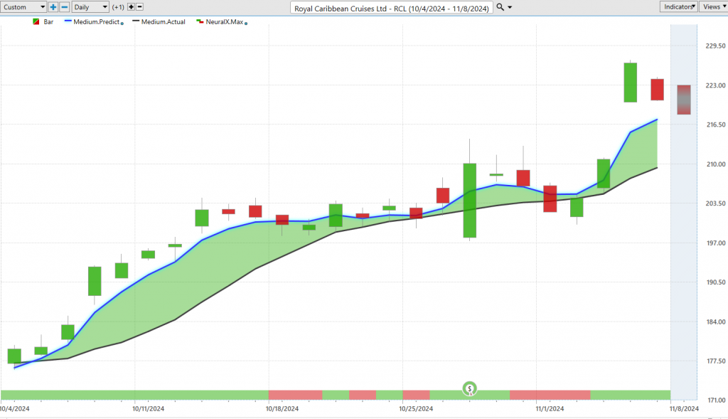 Again, we can take a look at the overall move here up about 15%, Royal Caribbean is another example here, a little bit longer term, right? So this going back all the way really about a month’s time to the beginning of October, and you’ll notice that when that blue line is above the black line, and the neural index is bullish, that’s where you see that momentum in the market, you can come in every single day with that forecast and say okay what’s going on what should we expect here both in the short and long term, but then you see the neural index gets bearish, and we run into those sideways consolidation periods where look the overall trend is up, right? As long as that blue line remains above the black line, you want to stay on the bullish side, but you may see some sideways price action over those 48-hour periods, and so you see not only that neural index goes bearish, but these predicted high and low ranges adapt and say okay well let’s look down towards these levels again a lot of noise around earnings where it actually just gaps down to that previous predicted low, and then the trend resumes to the upside here, so nice move in shares of Royal Caribbean, again we can take a look at the overall move with that predicted moving average still above the actual moving average, it’s about a 23% rally and just about 24 trading days, so again a pretty small position here even 100 shares has you up a few thousand,