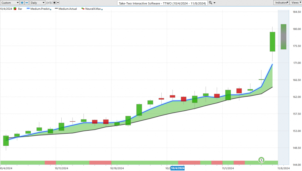 Lastly Take Two Interactive so a Take-Two Interactive Software tech stock here in software, again that blue line crossing above the black line here you get a couple more periods where that neural index goes bearish, and you really see this pretty clearly right when that neural index gets bullish, you see that momentum pick up in the market and advance much more likely to occur when that neural index goes bearish well you may still want to be long but look for cheaper prices and of course with that roadmap of predicted highs and lows well that’s where these levels are going to stand out say okay we scoop some up down at these predicted lows be around for that next advance in the market as that neural index gets bullish, and again a lot of earnings reports really seeing volatility increase around those levels but again Take Two really nice opportunity shares up about 177% just in the past 23 trading days so obviously a lot of excitement around the election we saw markets do extremely well after the results had come in and so you’re seeing a lot of these stocks that were in uptrend really advance even more especially if have earnings and some other catalysts they’re really propelling things higher so we’ll go ahead and leave it there for today once again this has been our hot stocks outlook for November 8th 2024 thank you all for watching best of luck out there and bye for now.