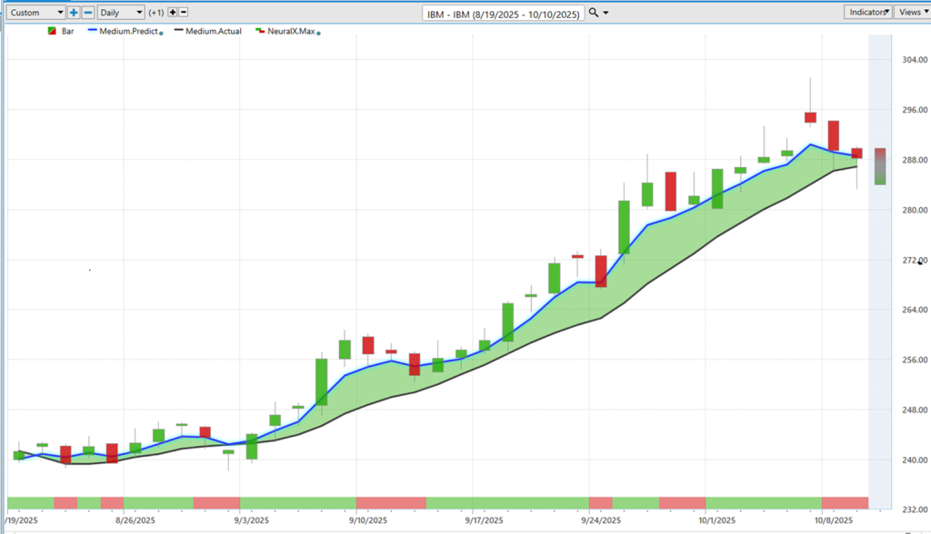 Uh IBM here. So a very uh uh uh you know longly traded stock here. Blue line crossing above the black line. Couple these instances where the neural index goes bearish, but again a lot of strength here uh in the overall forecast.