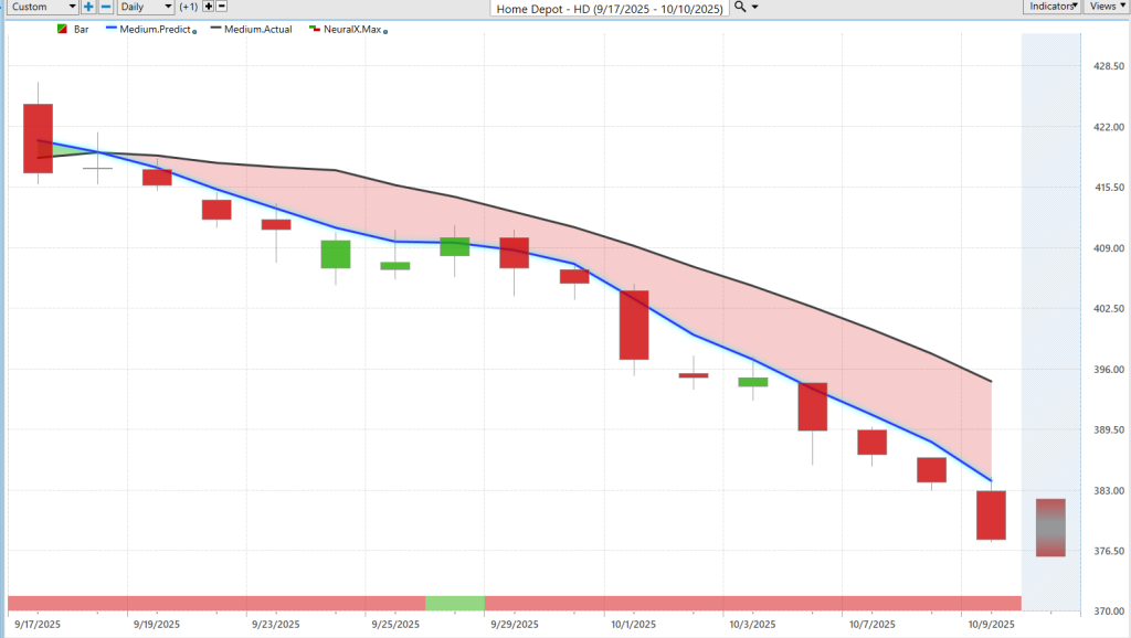 And so you don’t want to focus your attention there if you want to find opportunities to buy. Uh here we have Home Depot, uh very clearly here blue line below the black line, neural index bearish, and just a lot of separation uh between those values.