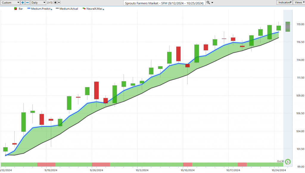 So nice move out of Sigma Lithium. Sprouts Farmers Market ($SFM), here Sprouts Farmers Market, very similar situation. We can, of course, take a look at those predicted highs and lows and multiple levels to accumulate positions. You see pretty much four days where the market is closing above that level, after soon hitting those