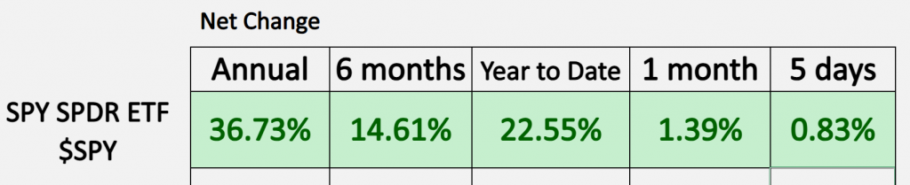 Now, like we typically do, we can look at the S&P 500 over these given spans of time just to get a sense of where things are at. Year to date, you see this takes us up about 22, almost 23% over the past 12 months; we’re up about 36% on the S&P, really having one of the best years ever as far as the S&P 500‘s concerned, with things running a little bit sideways on the indices, but still seeing some really nice opportunities out there in the market.