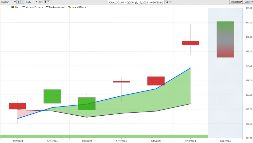 What we’re able to do is compare that black line to this blue line value, and for that number to be calculated and plotted against the chart, this is where VantagePoint is performing what we would call intermarket analysis to generate what we would call these predictive indicators or a predicted moving average. Specifically for Qualcomm, there are dozens of markets that are known to drive and influence future price. This can be things like the NASDAQ, the Q’s, the S&P 500 ETF, or even XLK (the technology ETF), but it’s also able to find and understand subtle relationships between stocks, whether this be other big tech stocks like Nvidia, the value of the Dollar Index, global interest rates, or even global commodities like gold or platinum.