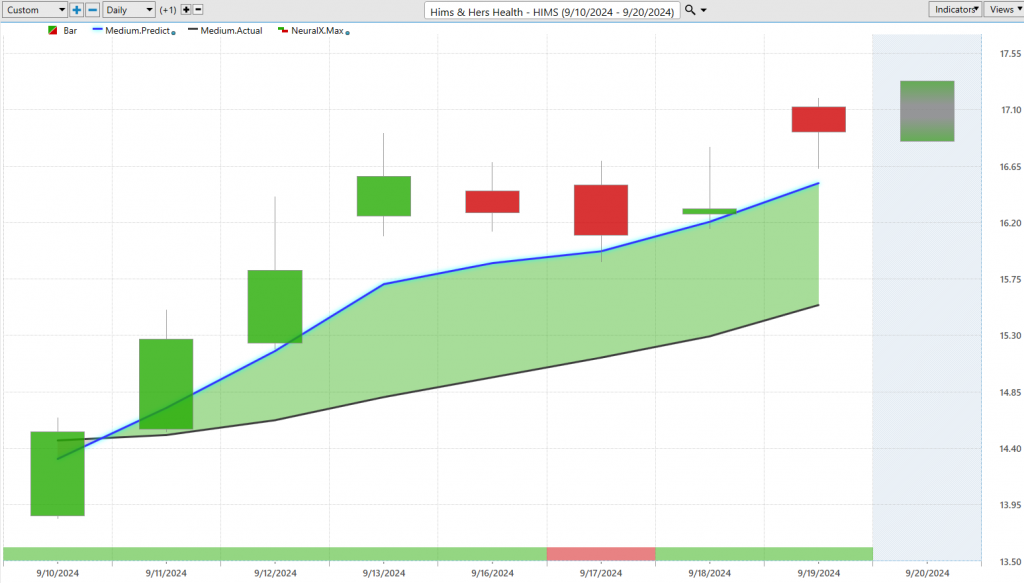Here’s Hims and Hers Health, another example of seeing these crossovers all across the space. So this even going into last week and saying, “Look, there’s a lot of strength in these markets, a lot of these even smaller cap stocks starting to turn higher, and you may want to take a long position.” Here you see that as far as the predicted highs and lows, we don’t move down to these predicted highs and lows early, but look how good the software is at adapting and saying, “Okay, well, look for this market to start moving lower, look for the range to start coming lower here, but the overall trend is very much bullish.” And you even see on this subsequent trading day, you really don’t get anywhere with that weakness from the neural index, but once it gets back to bullish, you see that momentum picking up, and the rally continuing. So, really nice move here in shares of Hims and Hers Health. Let’s see, just really seeing that crossover here, you’ve gotten about a twelve percent rally just in the past six trading days.