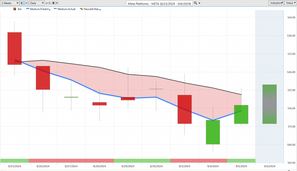 Now we are seeing again an uptick in volatility. Right, it’s not just a straight shot; we’ve had certain times in markets where almost everything’s moving higher. Here, shares of Shake Shack ($SHAK)—again, a good example of highlighting that. Look at the neural index at the bottom here, pretty much every single day, signaling, ‘Look, expect that market price to start moving lower over the subsequent 48-hour period.’ And um, you know, this works over a very large number of markets, right? So when you’re leaning on this tool, it has a very high level of accuracy, upwards of 80 plus percent, but we can really fine-tune this with the other predictive indicators that we’ve highlighted. So once we see that trend shifting to the downside, neural index bearish, of course, really short-term traders can say, ‘Okay, well, where exactly do we want to look for the overall trading range to play here over the next couple of trading days?’ And you can see how accurate all these levels are, indicating that really right after that trend shift came in, look, if you get up towards these predicted highs, you want to short, and be ready to take profits on short positions to go ahead and make some money. So actually, four entries there as the overall trend and price goes lower here in shares of Shake Shack. So overall here, seeing about an 8% decline, almost 9%, just in the past five trading days. And so this is why this is very important to understand where these shifts are happening, where to avoid, or potentially where to hedge your portfolio and actually take some short positions in the market. Really popular stock, here’s Meta Platforms ($META).