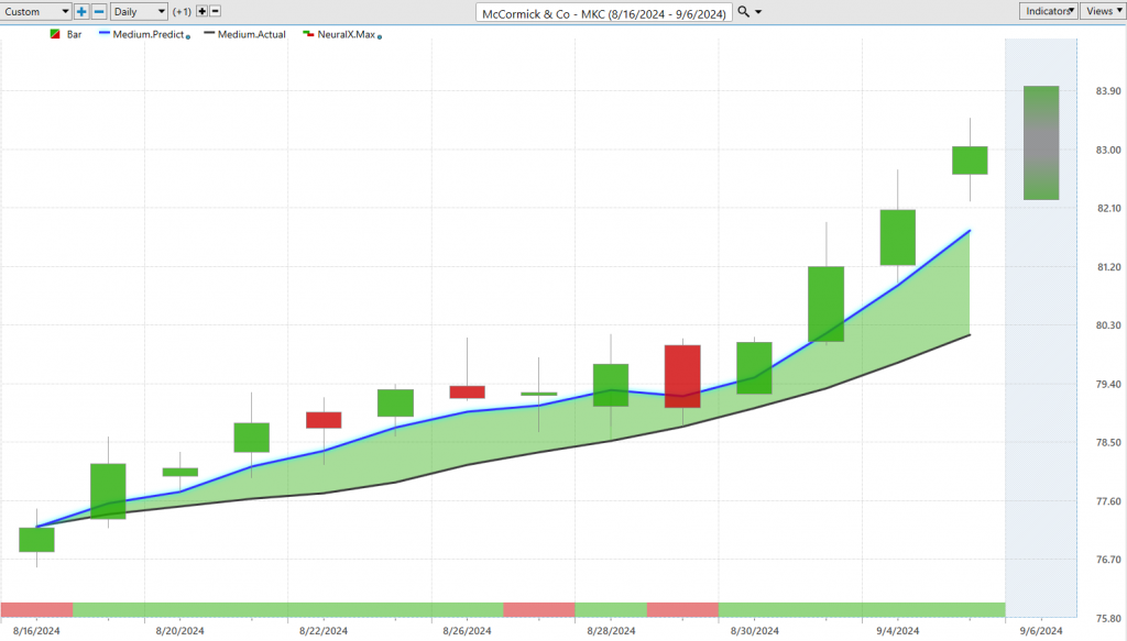 What we’re able to do is compare what we might call that lagging moving average to this Vantage Point proprietary predicted moving average. For this number, essentially a calculation of future prices, for that to get calculated and plotted on the chart, well, this is where the technology of artificial neural networks come into play. They’re performing what we would call intermarket analysis. So, what that means is, specifically for the target market—so in this case, McCormick—it’s going to look at markets that are known to drive and influence the future price of these shares. That can be things like big ETF groups, that can be things like other individual stocks throughout the marketplace, and you have to understand that some of these things share inverse relationships, positive correlation, some of these relationships are leading or lagging, and that’s where the effectiveness of neural networks is able to analyze this information and then incorporate that into these robust forecasts.