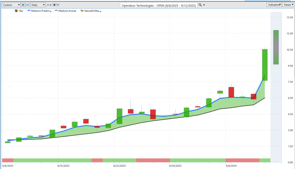 And so what we see here with Opendoor is this blue line crossing above the black line. Uh, we looked at this again last week. So what would be the last four candles here when we looked at this, and this is a great example of how these opportunities update and how the forecast updates and helps the trader adapt to those changing market conditions.