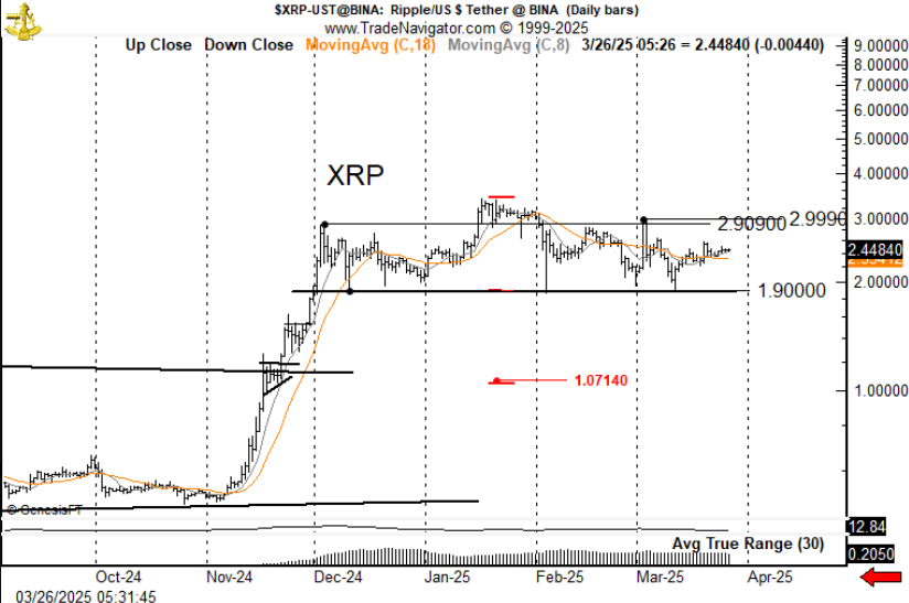 At the moment, XRP is trading at $2.30, which the veteran trader translates as range-bound trading. He notes that a spike above $3 will lead to a correction, while a dip below $1.9 will trigger a grim price slump.
