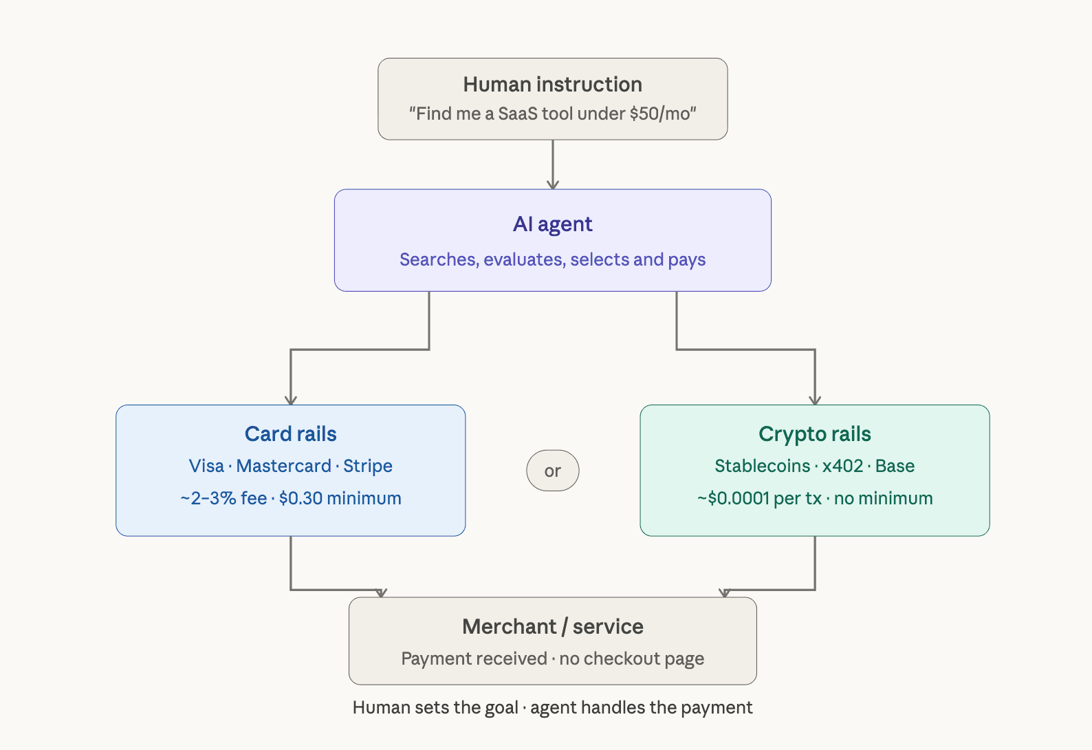 A human editor reviewing and publishing the piece might then be billed by a sub-agent that handled SEO optimization, another that ran plagiarism checks, and another that formatted for CMS software. Each micropayment is economically absurd on card rails, but trivial onchain.