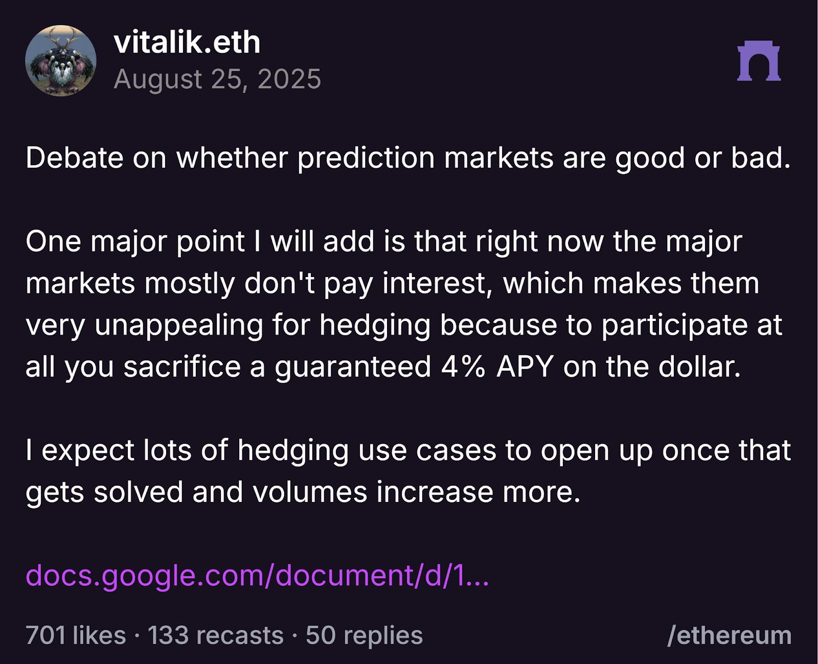 Ethereum co-founder Vitalik Buterin has said that most prediction markets are not suitable for hedging because they do not generate returns on funds used. In a post on Farcaster, he explained that participants must give up an annual yield of around 4% that is available on stable, dollar-based assets to take part.
