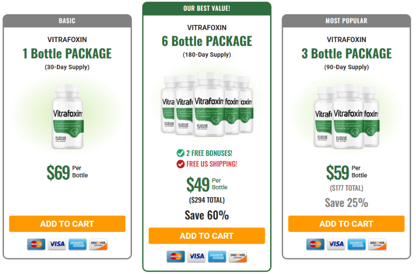 - The 1 Bottle Package offers a 30-day supply of Vitrafoxin for $69 per bottle. This is the basic option for those who want to try the supplement without committing to a larger supply.