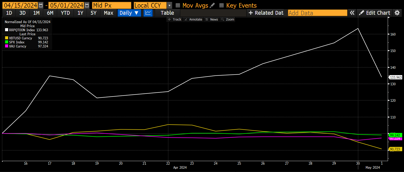 From April 15th to May 1st, the RRP (white) rose 33%, Bitcoin (gold) fell 9%, the S&P 500 Index (green) fell 1%, and gold (magenta) fell 3%. Each data set is indexed at 100.
