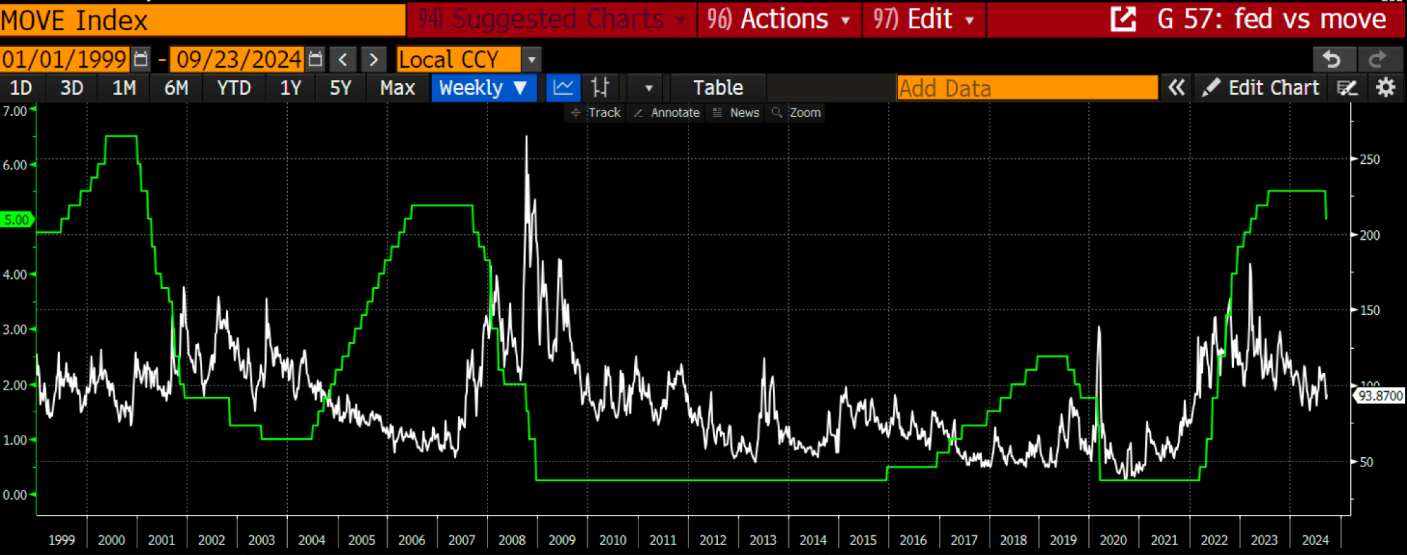 Some of y’all remember the run-up and collapse of the 2000 tech bubble. As you can see, the Fed popped the bubble by increasing rates until something broke. The volatility of the bond market spiked in 2000 and again in 2001 after the 9/11 attacks. As soon as volatility spiked, the Fed cut rates. Volatility fell, and the Fed felt it could normalise rates, and then boom, they popped the subprime housing market, which precipitated the 2008 Global Financial Crisis (GFC). Rates were quickly taken to zero for almost 7 years to smother volatility. Again it was time to normalise rates, and then COVID happened, which caused a bond market meltdown and spike in volatility. The Fed cut rates to zero in response. COVID-stimulus inspired inflation set the bond market on fire starting in 2021, which increased volatility. The Fed raised rates in order to slay inflation, but had to stop around the time of the March 2023 non-TBTF banking crisis. Finally, the current Fed easing cycle occurs at a time of heightened bond market volatility. If you consider the 2008 to 2020 era as “normal”, the current bond market volatility is close to double our master’s comfort level.