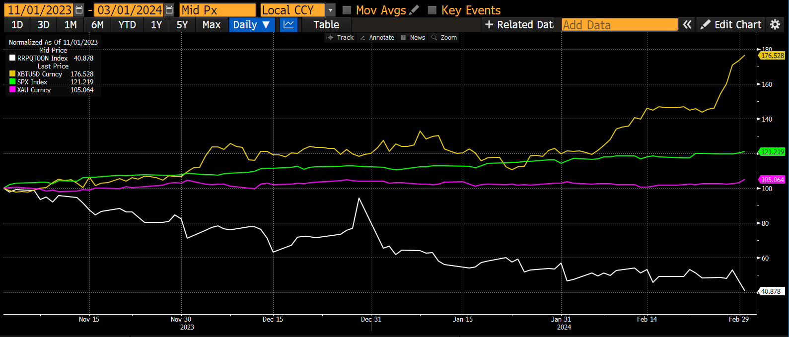 From November 2023 to March 2024, the RRP (white) fell 59%, Bitcoin (gold) rose 77%, the S&P 500 Index (green) rose 21%, and gold (magenta) rose 5%. Each data set is indexed at 100.