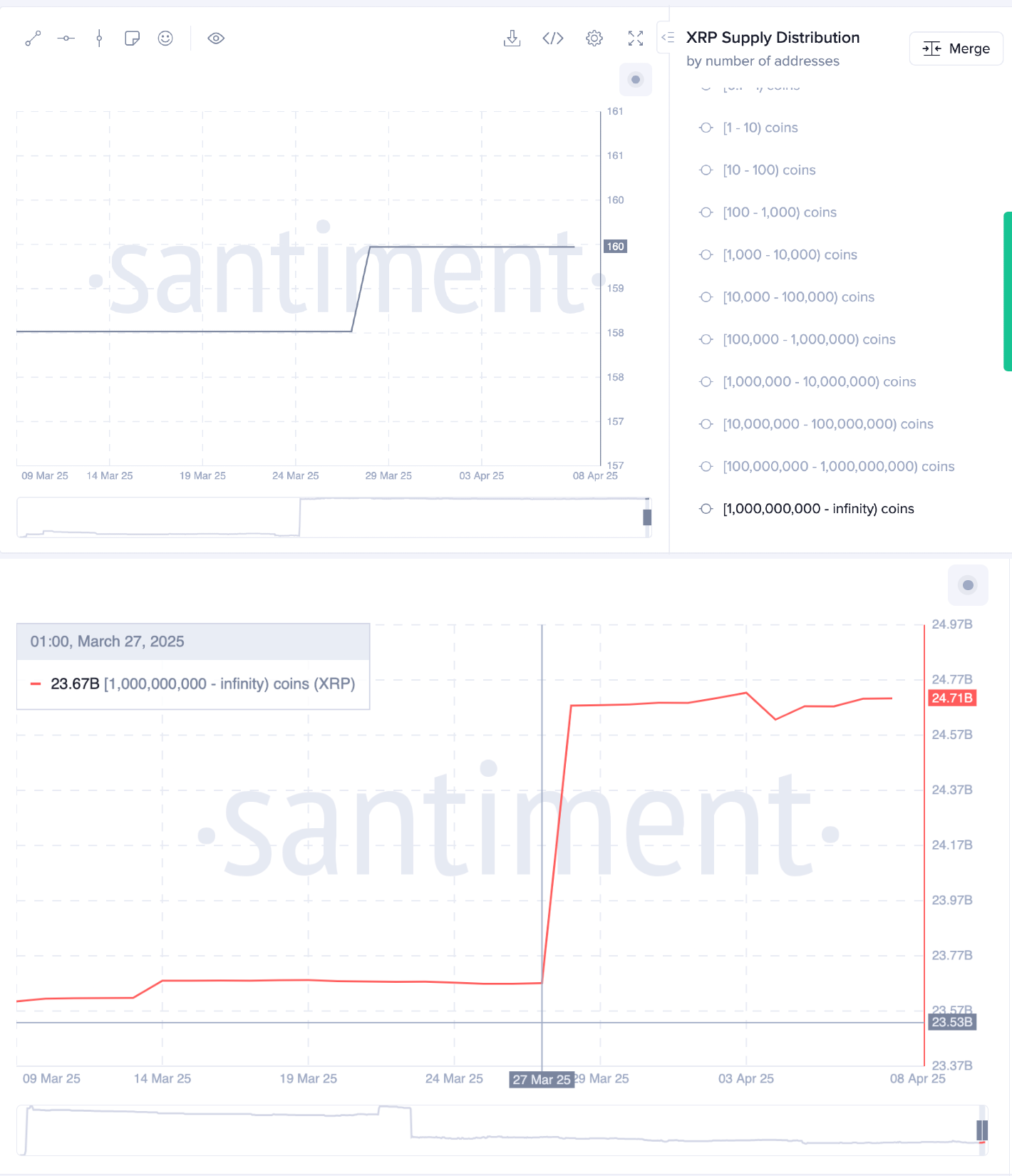 A closer look at the chart shows that the whales had recently increased their aggregate holdings by another 1 billion, increaseing their holdings from 23.7 billion XRP on March 27 to reach 24.7 billion XRP coins at press time on April 8.