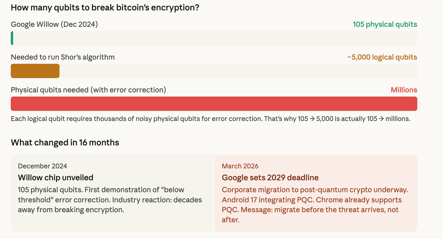 Bitcoin uses SHA-256 for mining and ECDSA for signatures, both of which are theoretically vulnerable to quantum decryption, but the consensus was that the threat was decades away. Breaking encryption would require millions of physical qubits (a unit of information in quantum systems). Willow had just 105.