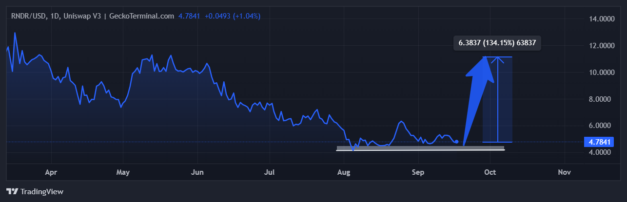 RNDR price, the native token on Render, is trading at $4.77 after dropping 3.8% in the last 24 hours. This AI project that heavily relies on powerful computer chips has been holding the $4 support for over a month, which means buying RNDR at these prices may be a good investment play.