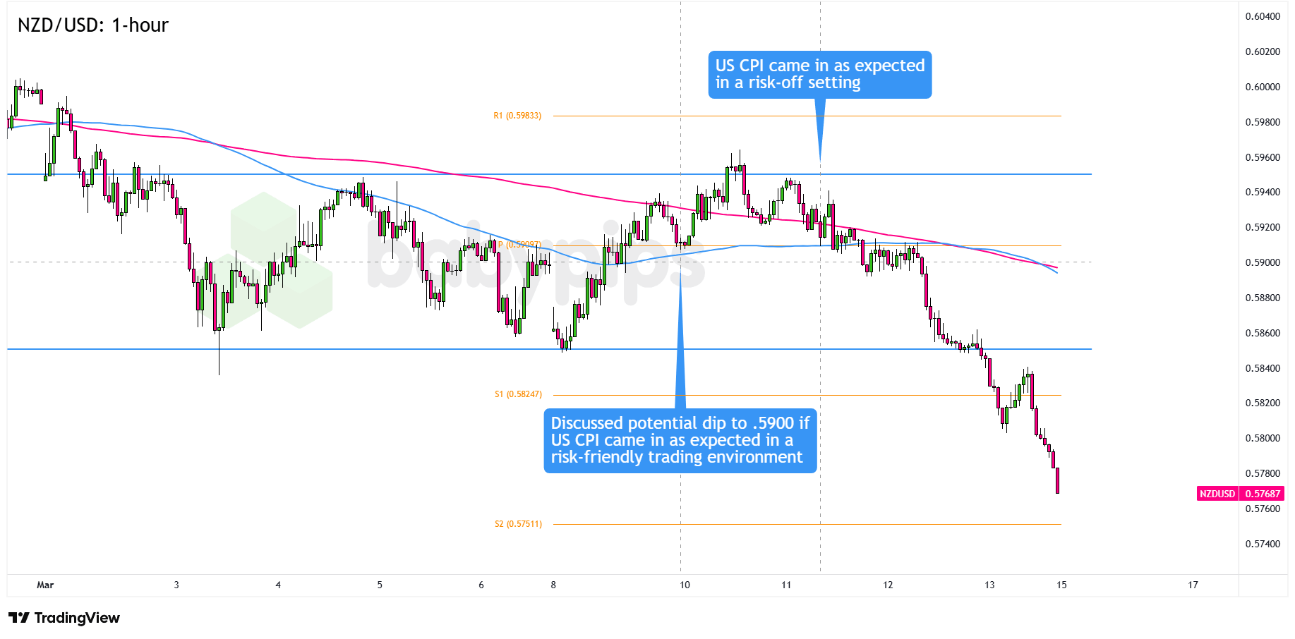 NZD/USD did slip and consolidate after the CPI release, but instead of stabilizing, the pair broke below 0.5900, picked up speed through S1 (0.5825), and was trading under 0.5780 by Friday’s close.
