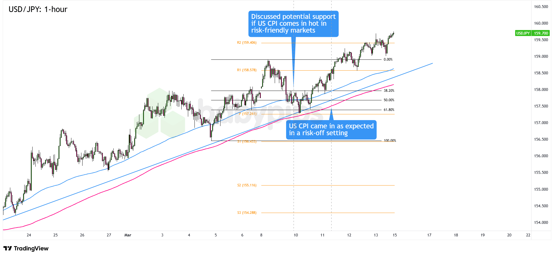 Still, USD/JPY carried on with its steady climb for the remainder of the week, keeping its head above the trend line support and pre-CPI levels while risk flows favored the safe-haven dollar while the yen reeled from Japan’s larger exposure to the oil crisis. Price even extended its rally past the swing high at the 159.00 handle, which then turned to support as dollar strength prevailed on upbeat mid-tier data printed later on.