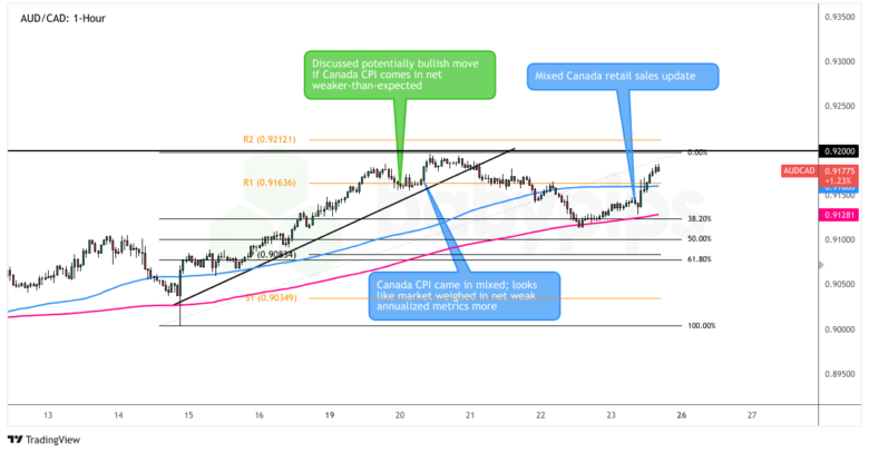 The initial market reaction was swift, with the Loonie taking a tumble across the board. Looking at our AUD/CAD chart, we can see that the pair indeed saw an immediate bounce following the CPI release, climbing from around the 0.9100 level towards the R1 pivot point at 0.9163.