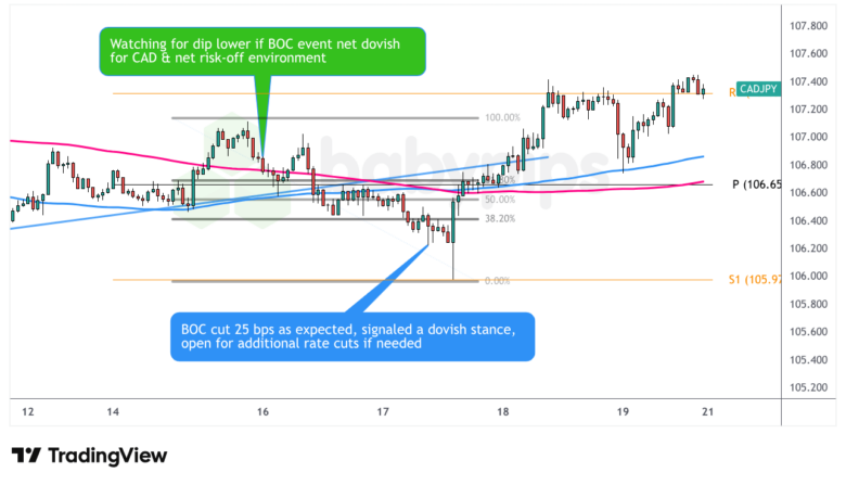 The actual announcement spurred another dip for CAD/JPY but the move was muted largely due to market anxiety ahead of the FOMC decision, which then led to a spike down to S1 (106.00) while CAD trailed the U.S. dollar in its initial selloff. A bounce followed during Powell’s not-so-dovish presser, bringing CAD/JPY back to retest the broken trend line.