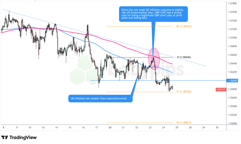 Our watchlist setups were mainly leaning towards an inline or upbeat U.K. CPI print, missing out on trade ideas for a possible downside surprise. Instead, a GBP/CHF short bias emerged as arguably the most viable setup for the week, given the target event outcome and prolonged market uncertainty.