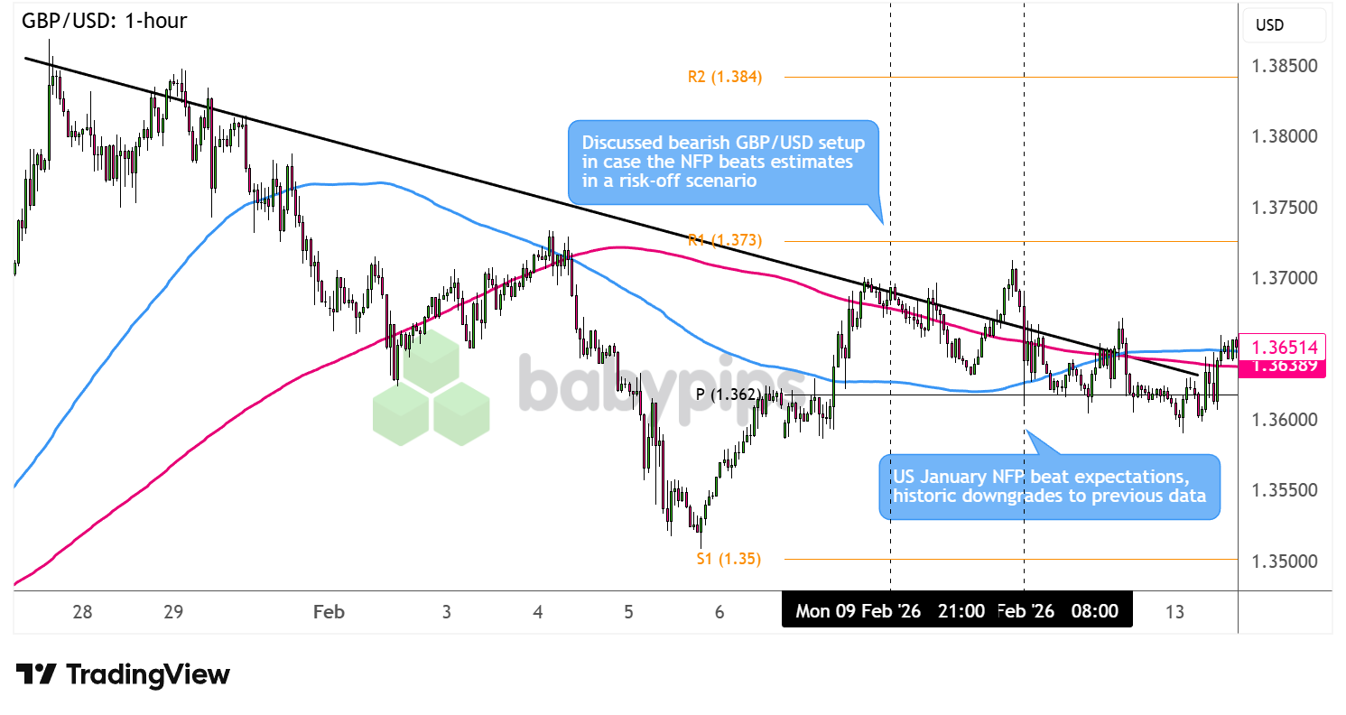Instead, NFP printed at 130,000 versus the 65,000 to 75,000 consensus, giving the dollar an initial pop. But steep downward revisions quickly changed the tone, forcing a rethink on Fed expectations and turning the release into a net USD bearish event. At the same time, U.S.-Iran tensions and AI jitters kept sentiment cautious. The USD-bearish report, combined with a risk-off trading environment, invalidated GBP/USD’s setup from moving beyond the watchlist stage.