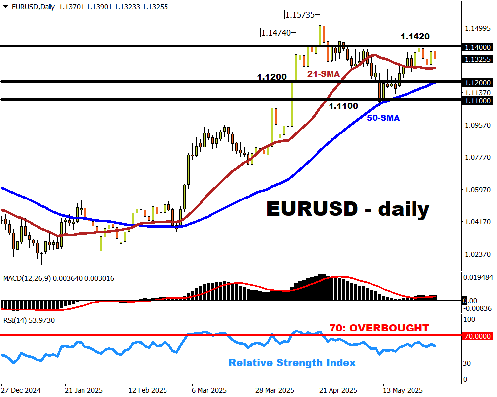 - EURUSD set to end May unchanged; mostly kept to 1.11 – 1.14 range this month