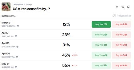 Prediction markets are putting the odds of a US-Iran ceasefire by end-April below 50%.