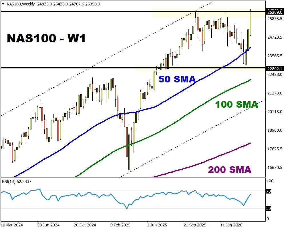 The spotlight shines on FXTM’s NAS100 which has rebounded 16% from its 2026 low.