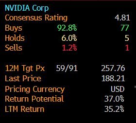 According to Bloomberg consensus, over 90% of analysts are bullish on Nvidia with the 12 month price target at $257.76 – roughly 25% away from current prices.