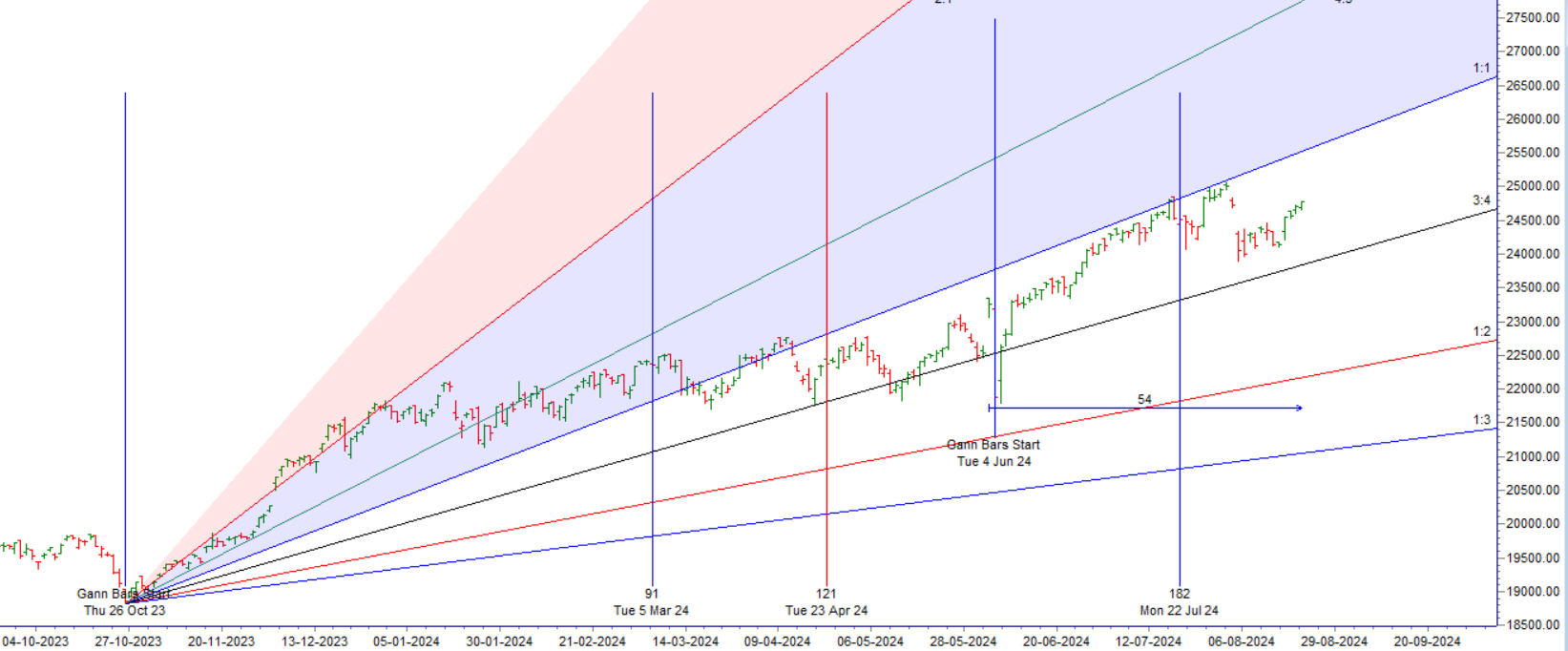 Nifty continued its higher high formation as the price rallied for five consecutive days. According to Gann’s Rule, if the market rises for five consecutive days, there is a high probability that a correction will last for three days (following a 5:3 ratio). For the correction to commence, the price needs to close below 24,654. However, if the price moves above 24,800, the probability of reaching a new all-time high increases. Additionally, with the Sun moving into Virgo tomorrow, it’s wise to keep PSU stocks on the radar for potential opportunities.